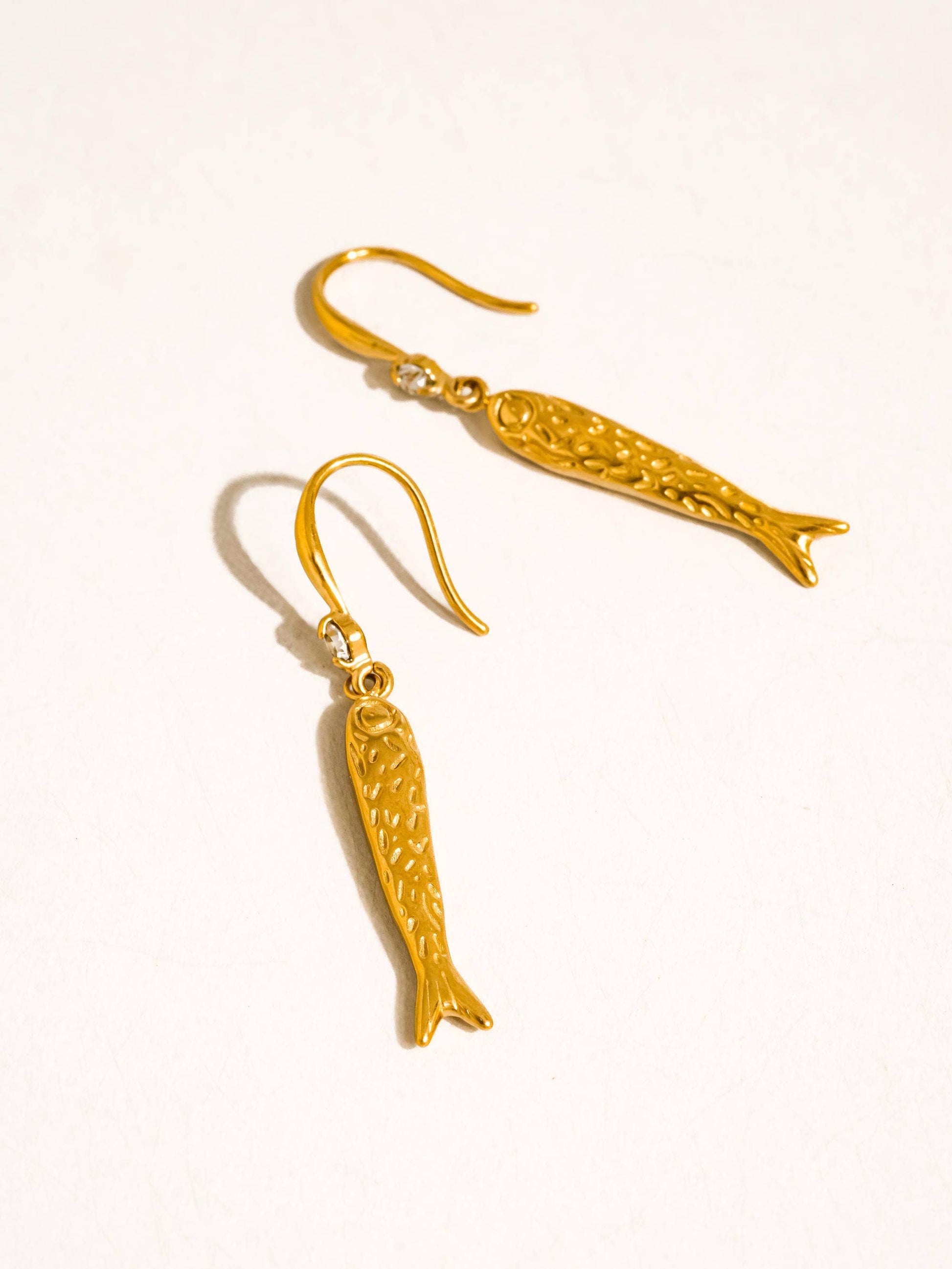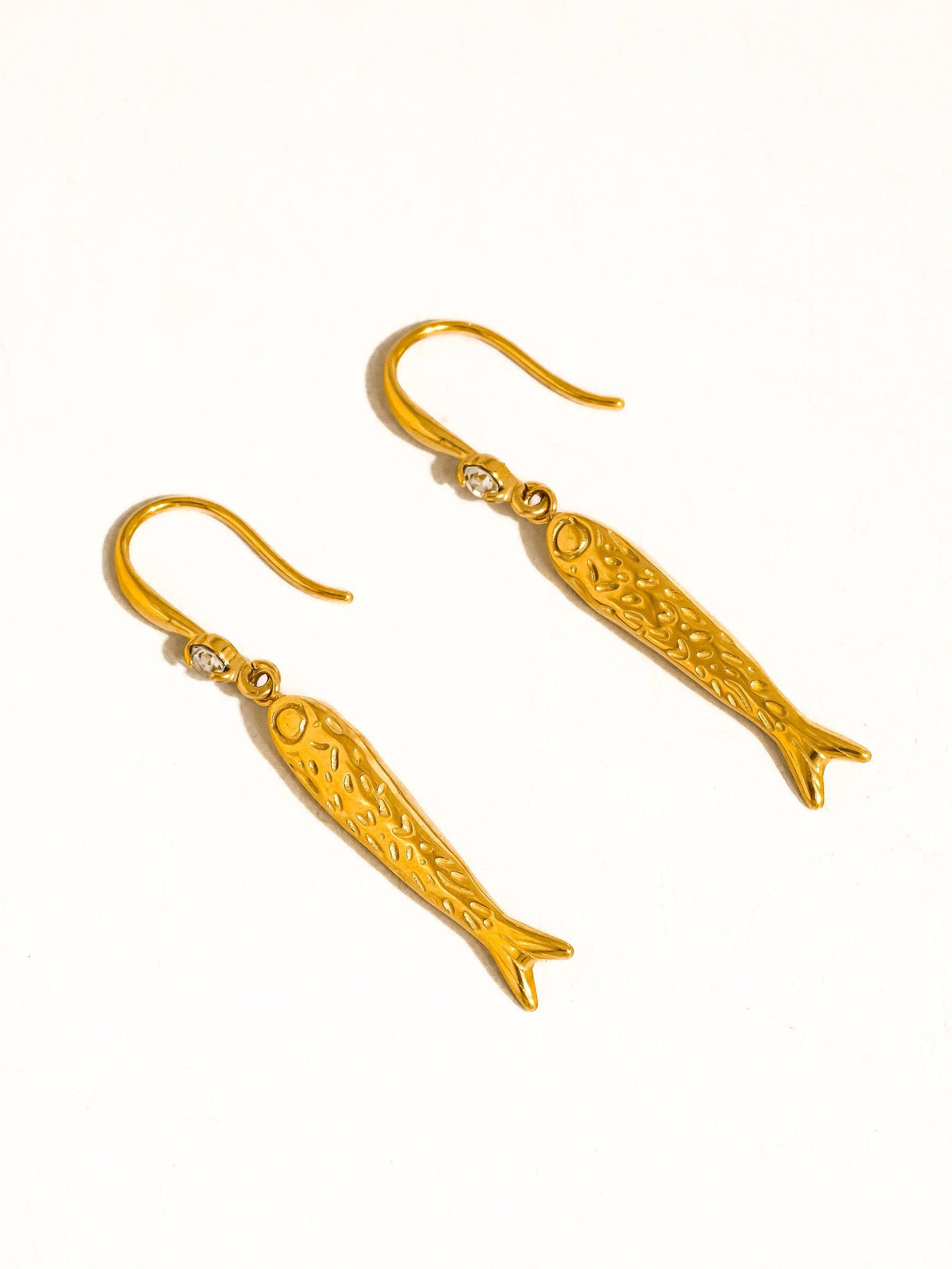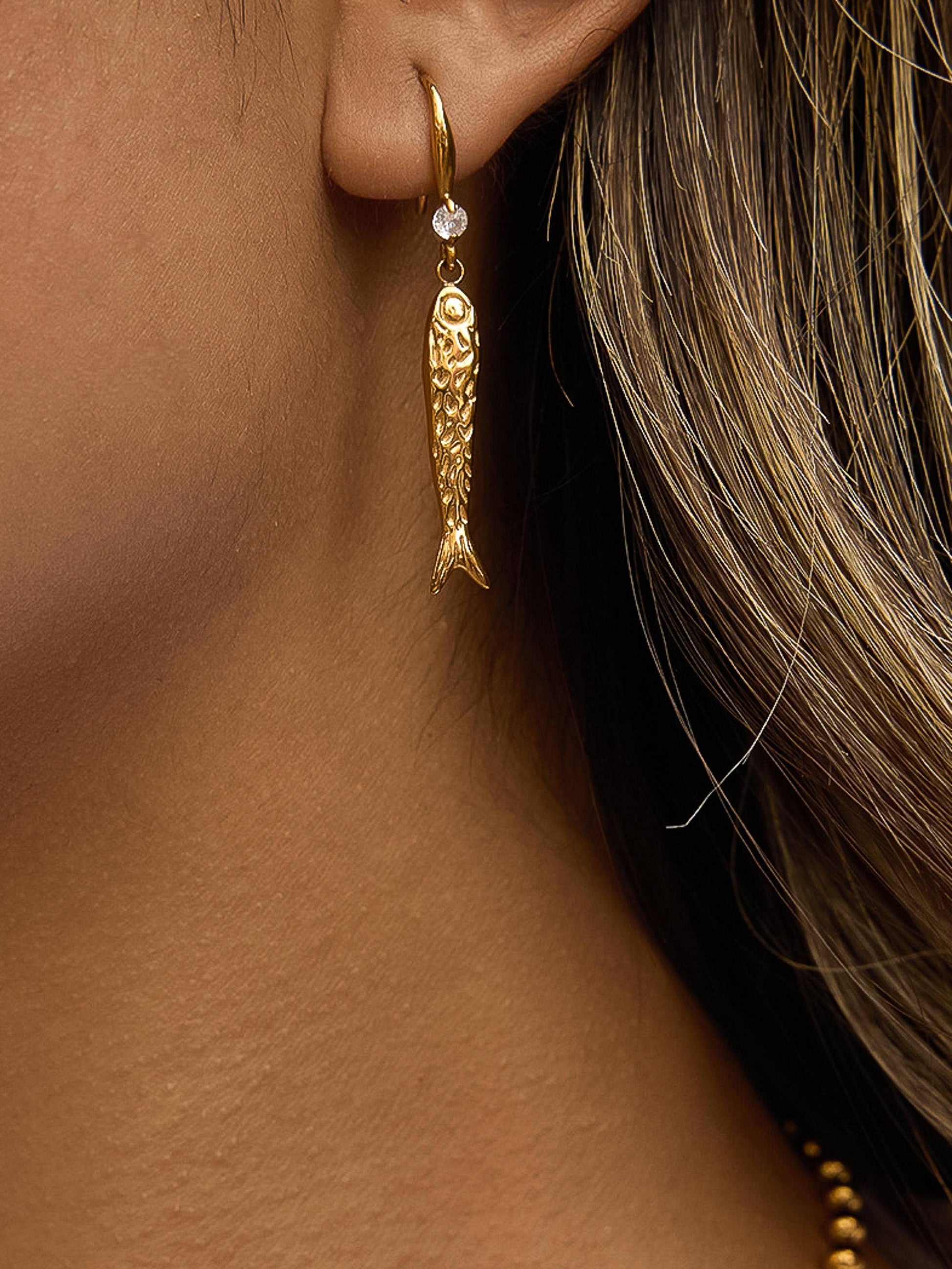 18K Gold Non-Tarnish Fish Charm Drop Earrings 18K Gold Plating Stainless Steel Measurement (L x W inch): 1.14 x 0.19 - Lead-free, Nickel-safe - Hypoallergenic - Water Resistant